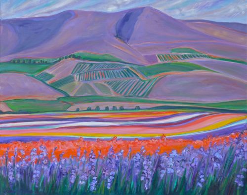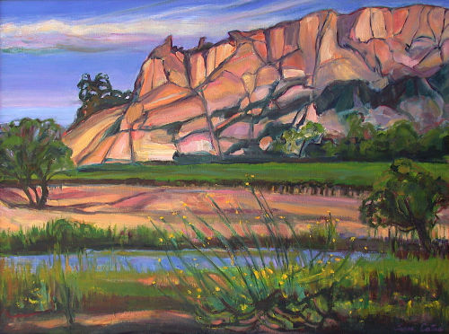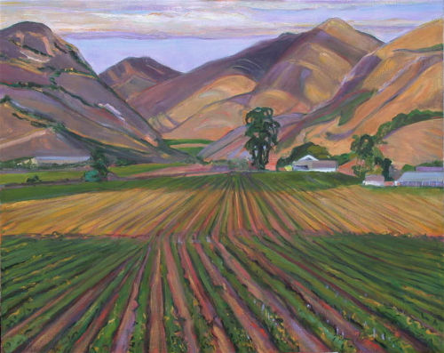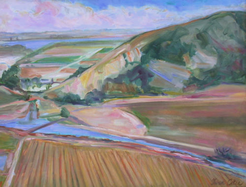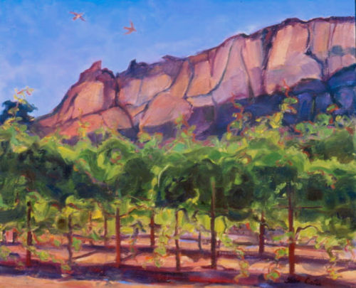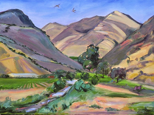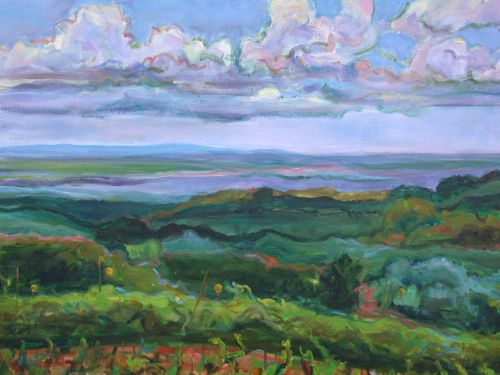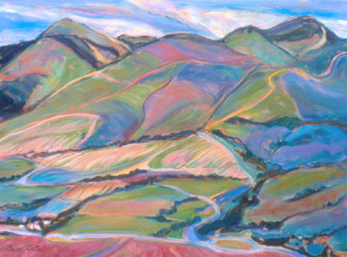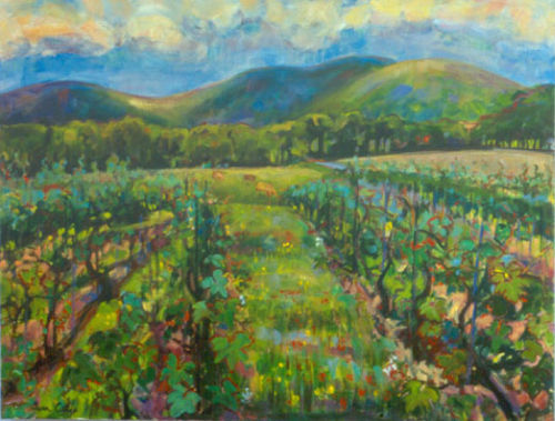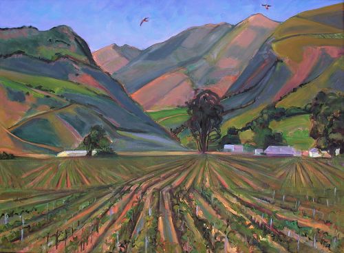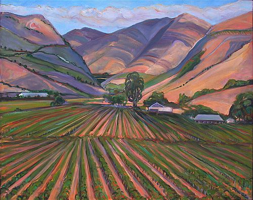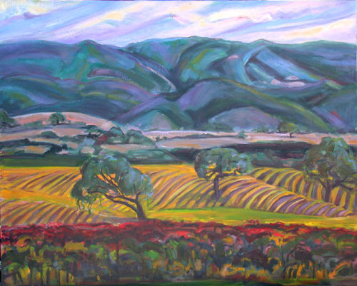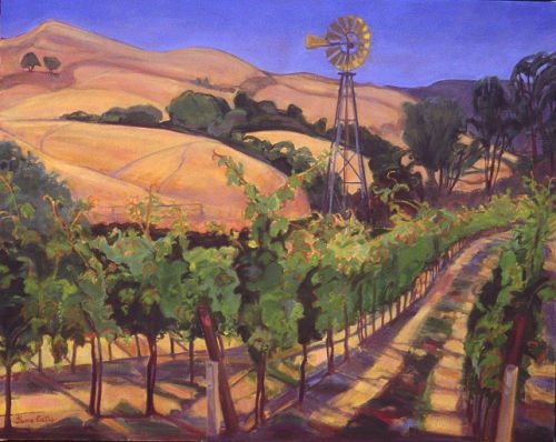 In the central coast area of California there is a virtual sea of grapes which climb the hills to underline the sage and ochre mountains with green. The more I visited these magnificent settings while living in California, the more I discovered about the individual personality of each location. Now that I have moved back to Virginia, I am discovering many new wineries in beautiful settings that I would like to explore with paintings. This will be a continuation of vineyard paintings that I created in Virginia Vineyards before moving to California seventeen years ago. Two of the paintings on this page were done in Virginia. |